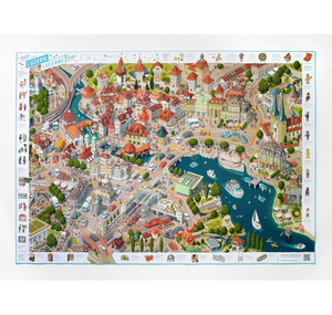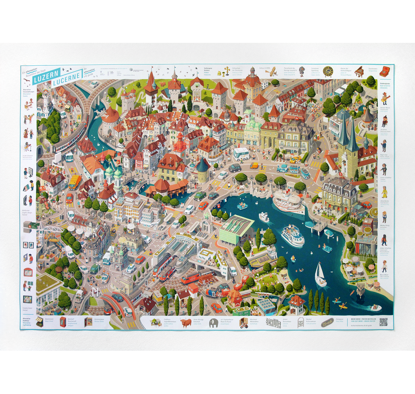 „Luzern – Ein alternativer Reiseführer“ ist ein illustratives Wimmelbild-Poster, welches sich einigen weniger bekannten, aber durchaus entdeckenswerten Aspekten der Stadt widmet. Diese sind rings um das Wimmelbild aufgeführt und können im Bild selbst gesucht werden. Via QR-Code gelangt man zu weiterführenden Informationen wie z.B. den Adressen der vorgestellten Orte.