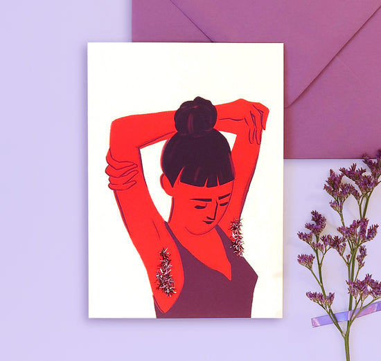 Jede Grußkarte wird von Hand mit funkelndem Glitzer als Achselhaare verziert. Dank dieser Veredelung sind alle Grußkarten ein kleines Unikat. Jede Grußkarte wird in eine durchsichtige Zellophanhülle verpackt, damit sie sicher an ihren neuen Bestimmungsort gelangt.