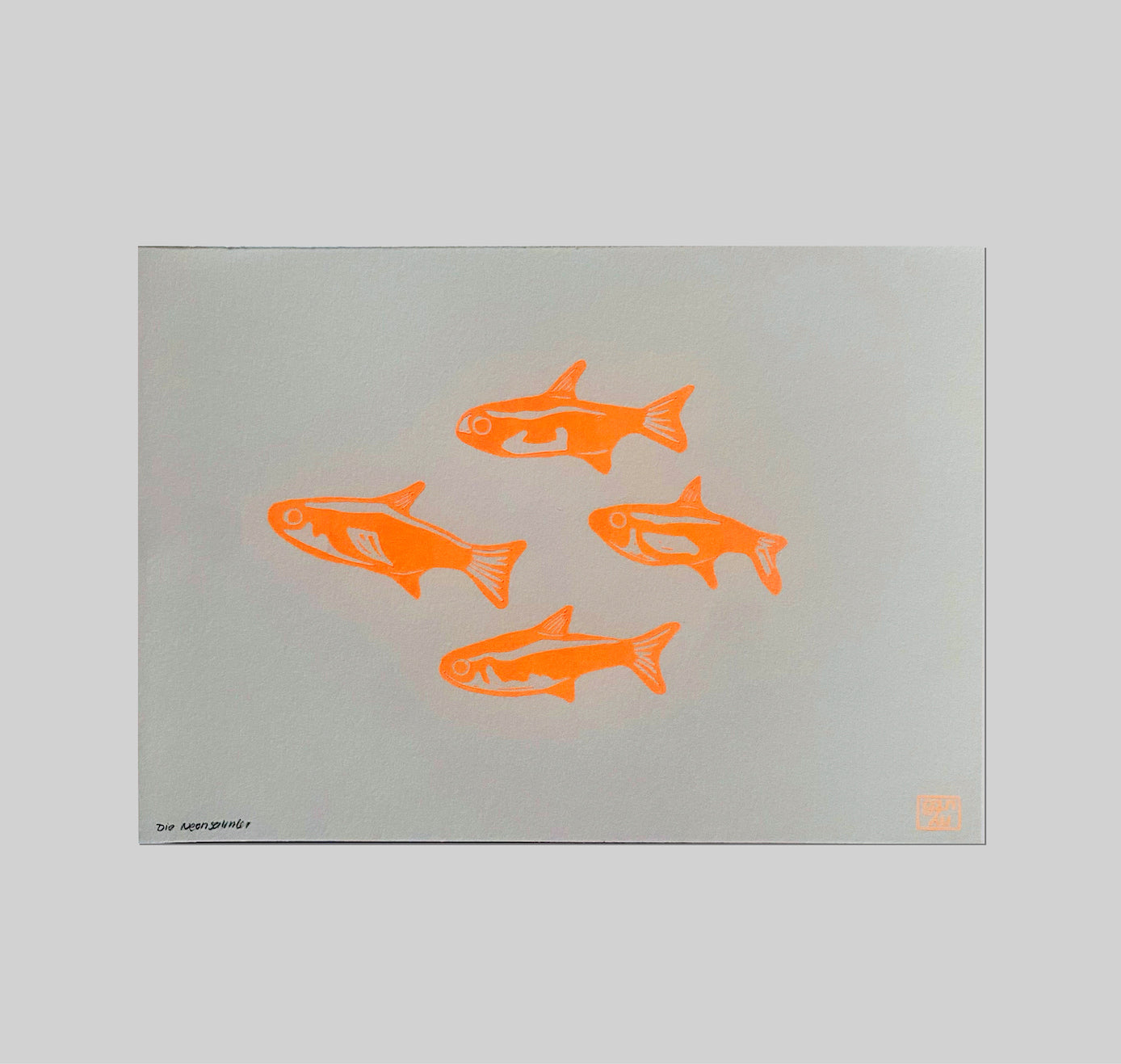 Technik: Linoldruck in leichtem Farbverlauf (rötlich zu orange)