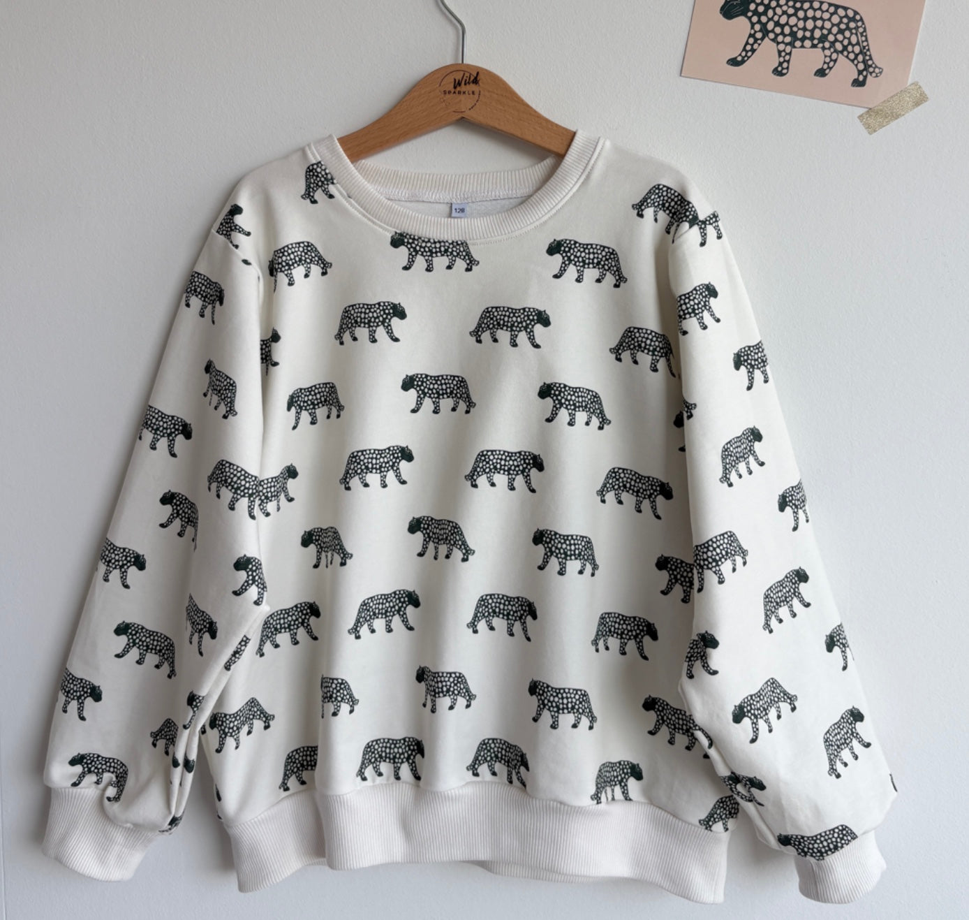Sweater in Zusammenarbeit mit Ambre von Wildparkle! Entdecke unser Oversized Sweater mit trendigem Leomuster, das deinem Outfit einen lässigen und verspielten Touch verleiht! Der absolute Hingucker ist der coole Leopard-Print. Perfekt für alle, die Komfort und Stil kombinieren möchten. Durch den Oversized-Schnitt erhalten die Kinder einen lässigen Look und garantierte Bewegungsfreiheit. Der Sweater wird durch Rippbündchen am Halsausschnitt, an der Ärmeln und am unteren Rand ergänzt. Hergestellt aus French Terry, auch Sommersweat genannt, ist dieser Pullover nicht so warm wie ein herkömmlicher Sweatstoff. Es eignet sich ganzjährig. Der Sweater wird in der Schweiz für dich handgefertigt! Der Stoff ist mit dem Oeko-Tex-Zertifikat ausgezeichnet und wird in der Niederlande bedruckt, mit umweltfreundlichen Drucktechnologien (reduzierter Wasserverbrauch). Willst du mit deiner Mama im Partnerlook strahlen? Kein Problem! Ein Sweater mit gleichem Leosujet ist auch für Erwachsene erhältlich, um den „Matchy-Matchy“-Look zu perfektionieren. Der Sweater wird nach der Bestellung extra für dich hergestellt! Dadurch verhindern wir unnötigen Materialverschleiss und du kannst dich auf dein persönliches Exemplar freuen.