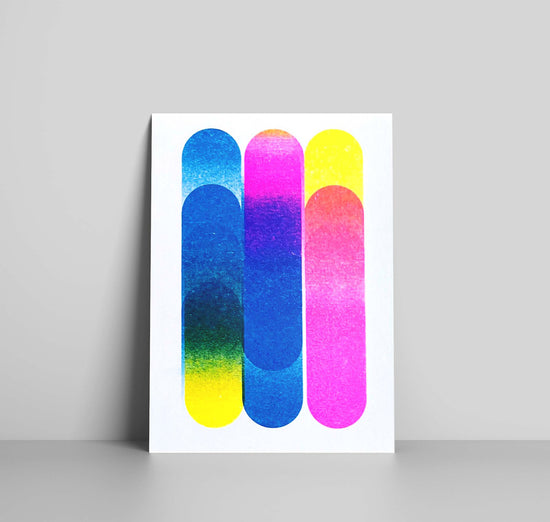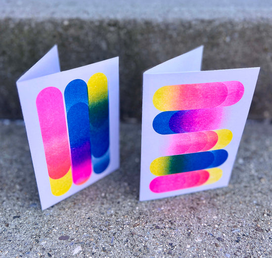 Riso-Klappkarte «VertiGradient» aus den Farben Neon-Pink, Yellow, Teal