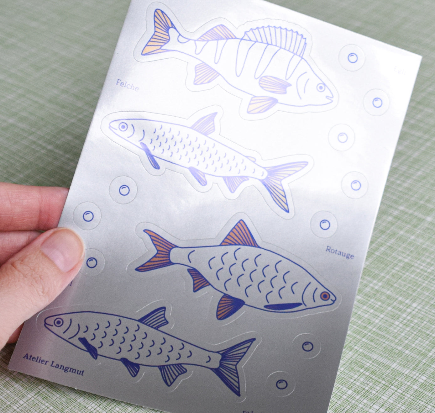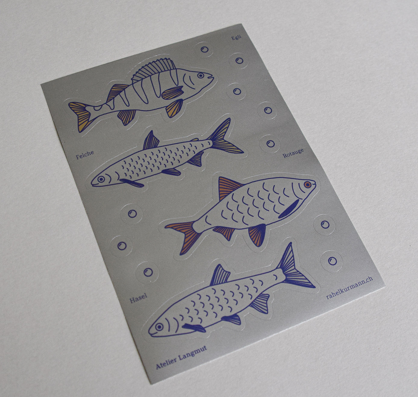 So einfach geht Fischen – mit diesem Stickerbogen holst Du dir vier typische Schweizer Fischarten nach Hause. Liebevoll illustriert und auf silberne Folie gedruckt. 1x Stickerbogen, Format: A6, Druck: Digitaldruck auf silberne Vinylfolie, Vorderseite: glänzend, Rückseite: klebend