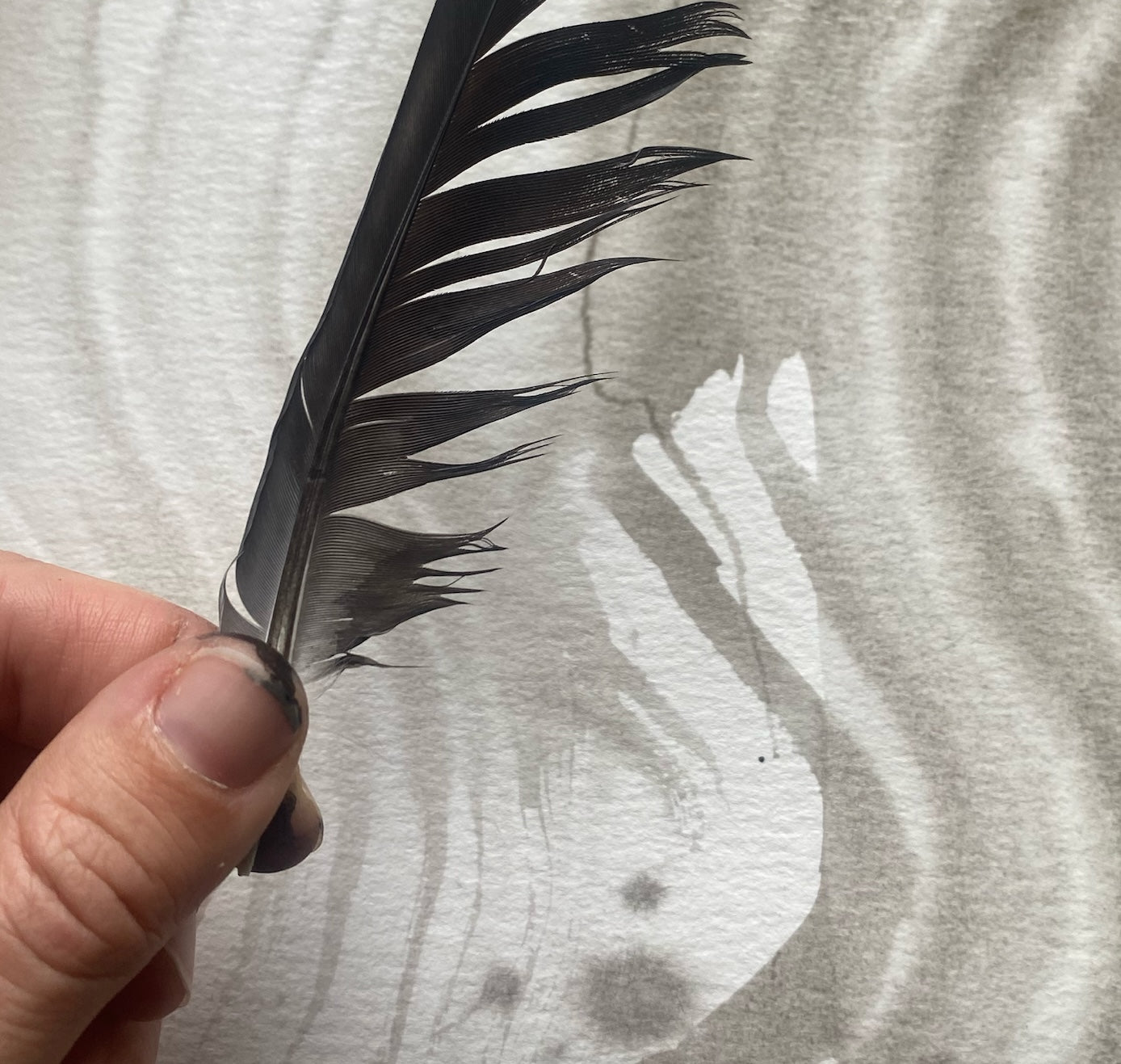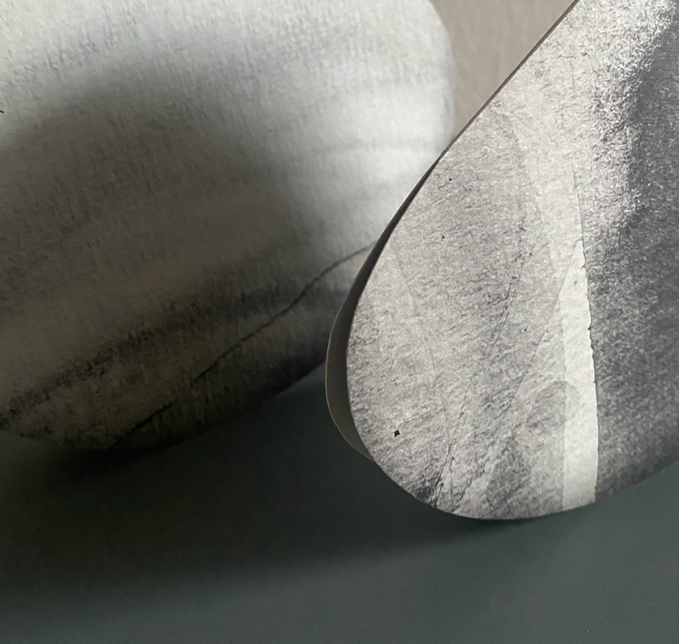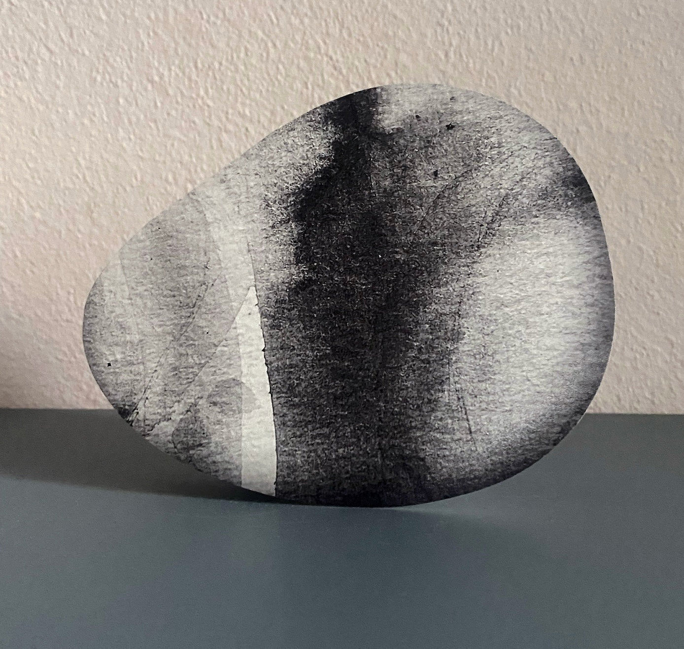 Cette double carte en pierre imite à la perfection une véritable pierre. J'ai expérimenté avec amour aquarelle, gouache et craie pour recréer les textures des galets. Progressivement, j'ai scanné différentes textures et les ai intégrées aux contours de chaque pierre jusqu'à trouver la portion idéale. Le résultat : trois pierres différentes qui, exposées ensemble, créent un effet harmonieux. Toutes les cartes ont été découpées et pliées à la main. À l'intérieur, on peut lire : « Dans le silence de la pierre réside le pouvoir de l'éternité. »