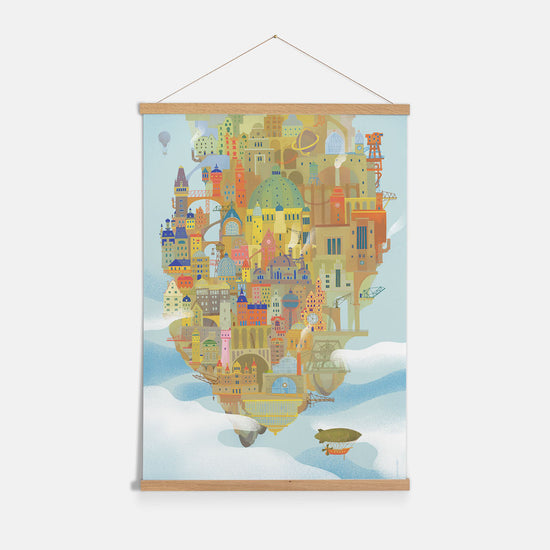 L'affiche A2 (42 x 59,4 cm) Flying City est une impression offset de haute qualité sur papier mat non couché, produite en Suisse.