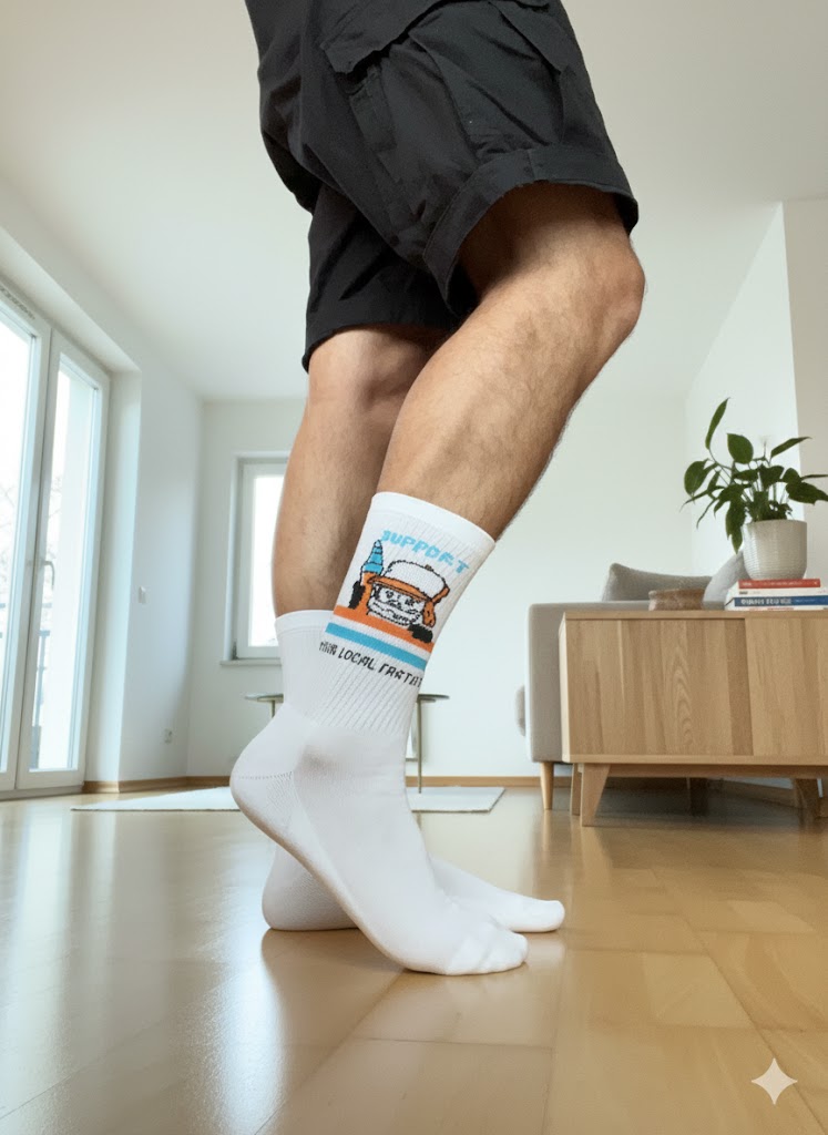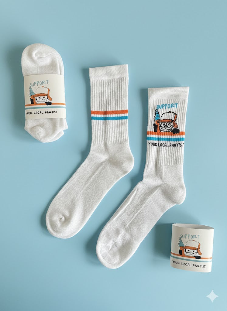 In collaborazione con SupportYourLocalArtist.ch È stato creato questo esclusivo calzino sportivo, che include il gioco di parole ironico "SUPPORT YOUR LOCAL FARTIST".