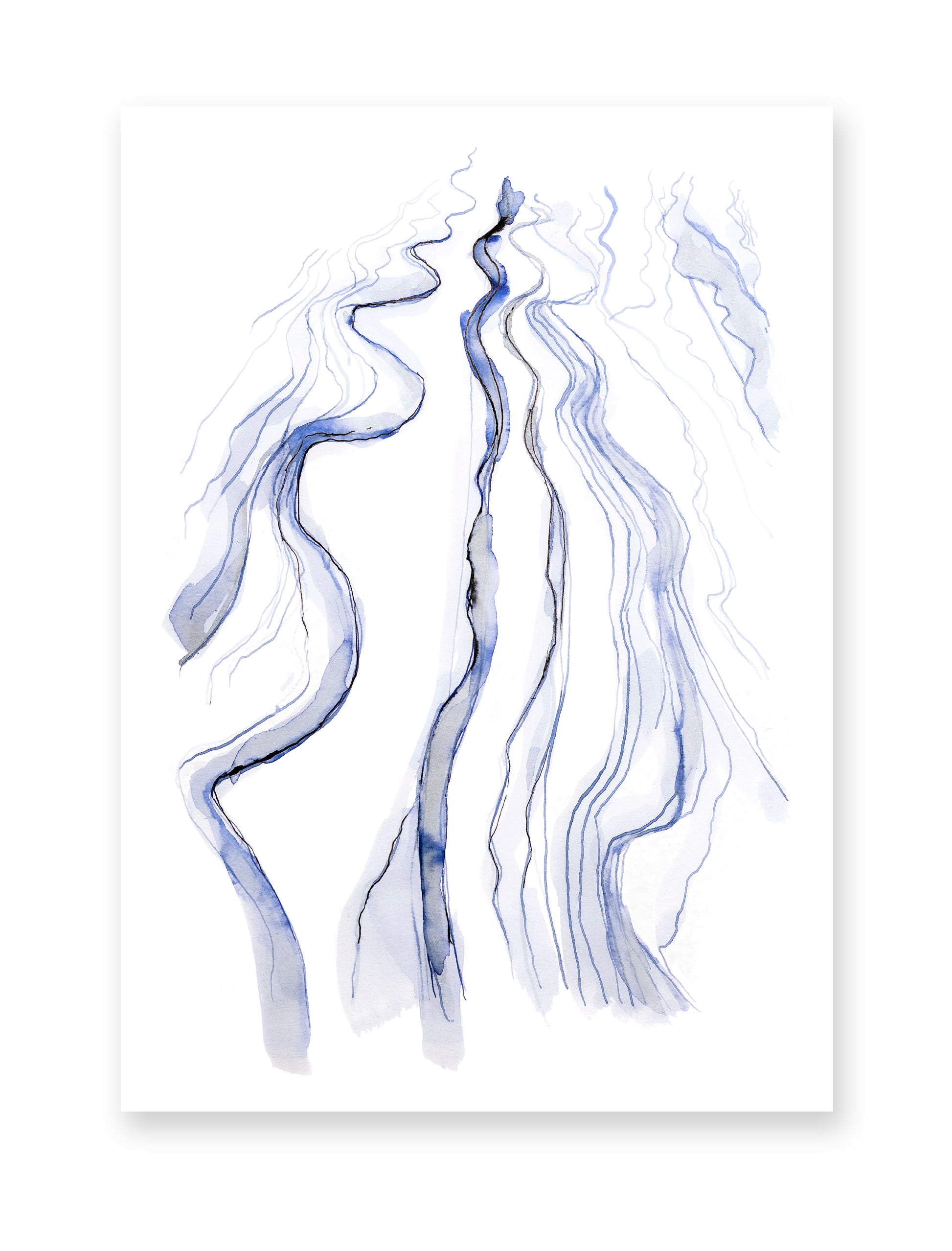 Doch aus dieser Misere entstand eine neue Faszination: Die filigranen Verwehungen im Schnee hatten etwas Magisches. Wir machten mehrere Fotos und staunten über das „Kunstwerk des Windes“. Inspiriert von diesen natürlichen Wellen entstand die Idee, die Formen auf Papier zu bringen. Wie der Wind selbst brauchte ich viele Versuche, um meiner Vorstellung gerecht zu werden. Jede Zeichnung entwickelte sich aus dem Variieren, Wiederholen und Experimentieren mit Wasser, Tusche und Farbpigmenten.