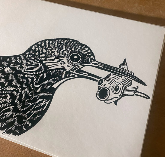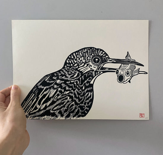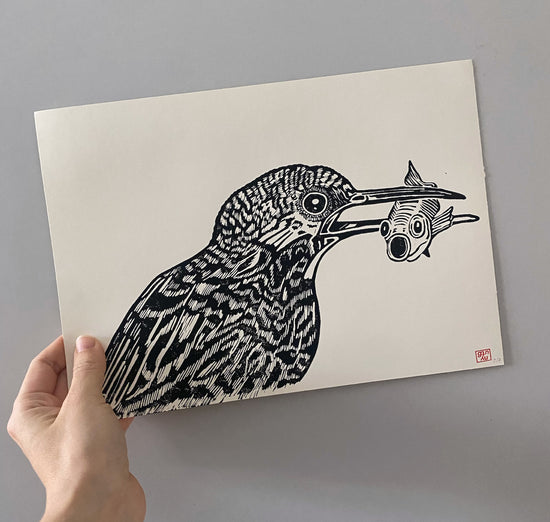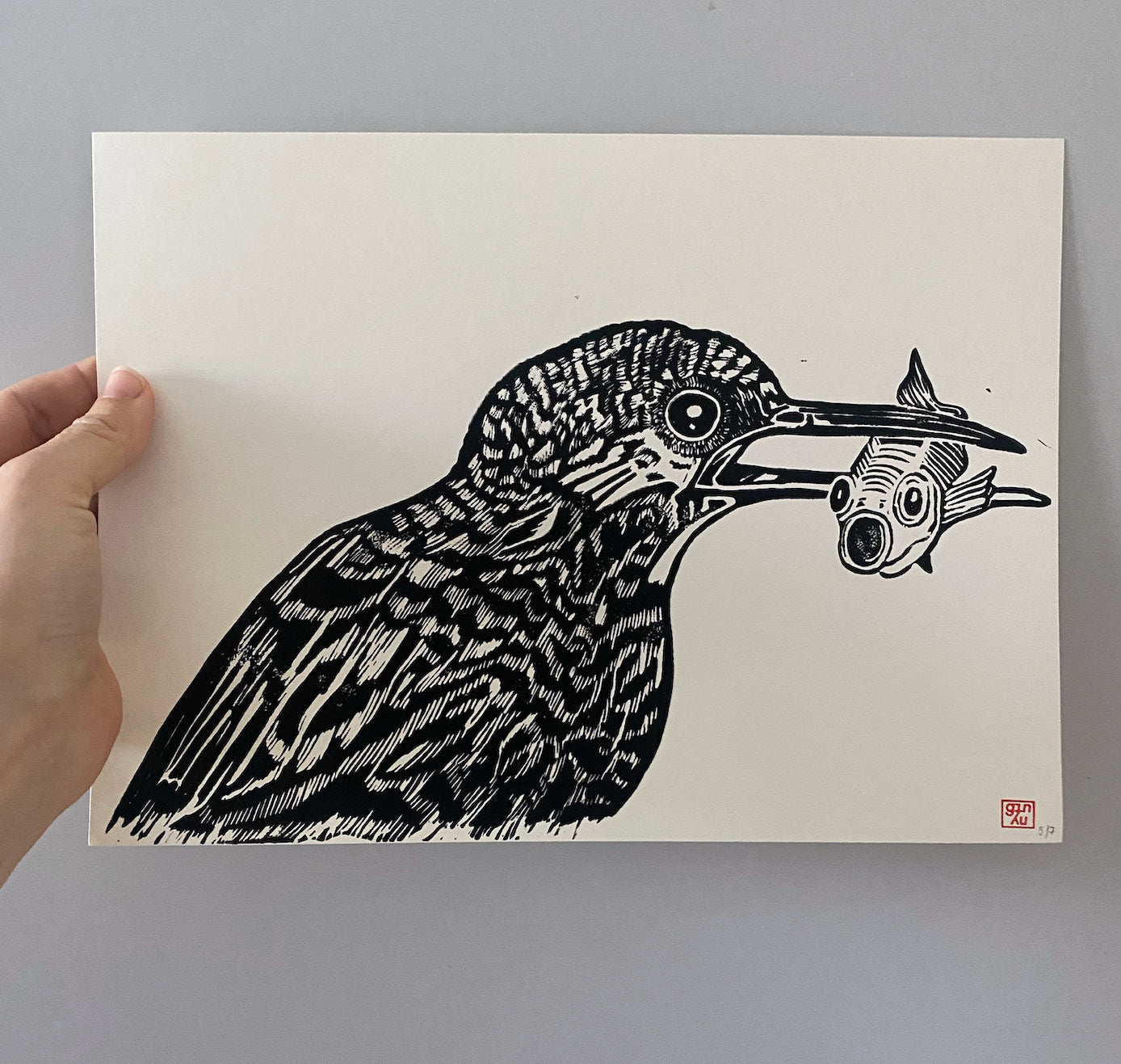 Stampa linoleografica originale "Il martin pescatore" prima edizione