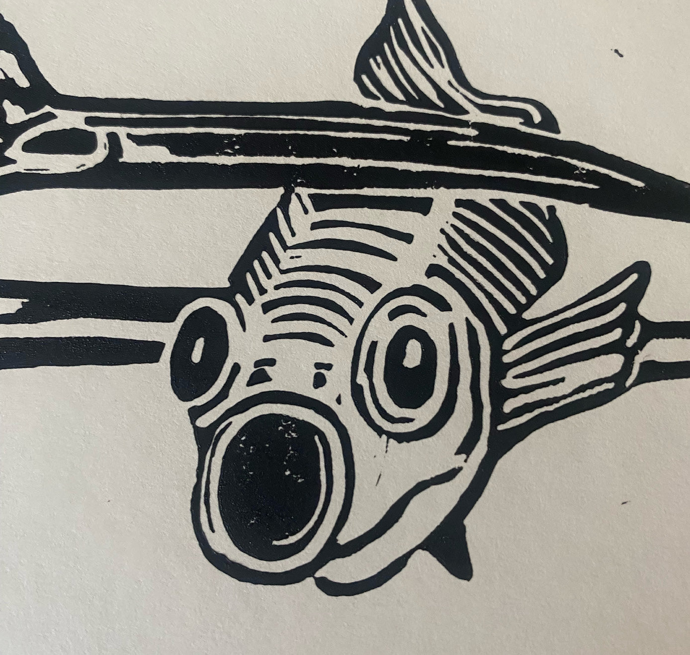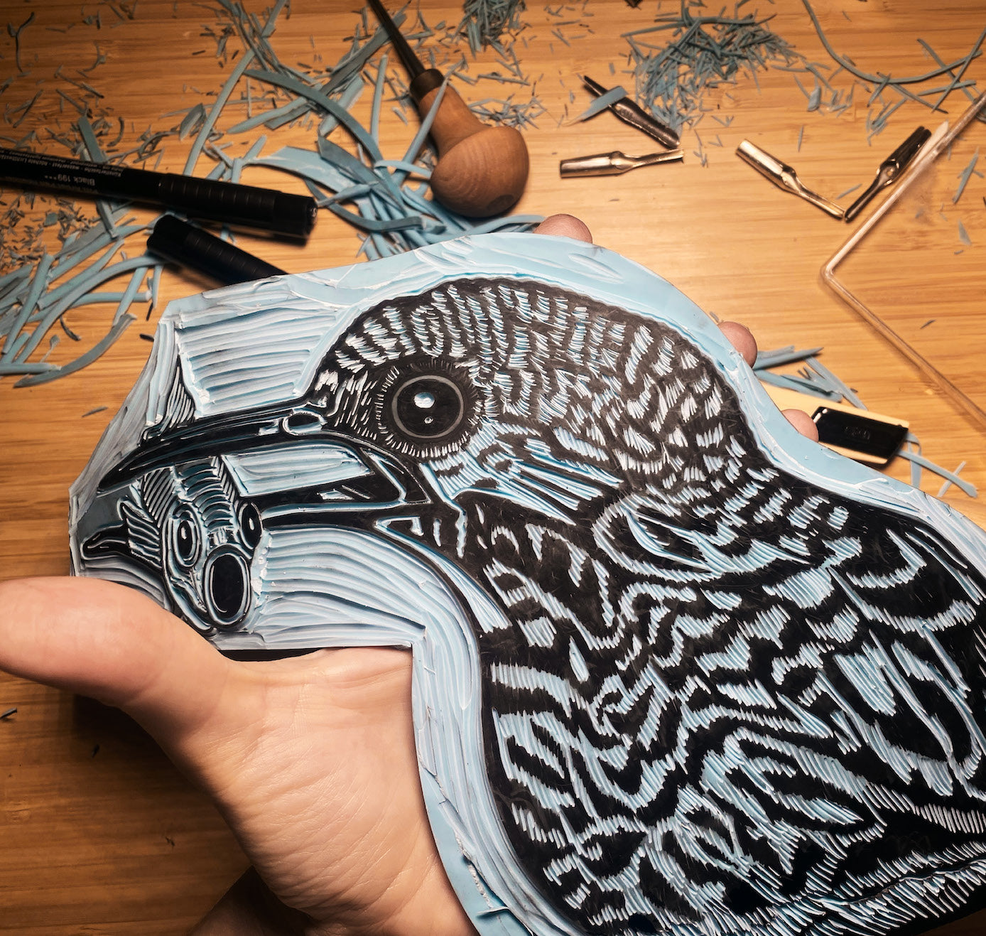 Carta: carta mista FSC, beige-bianco. Tecnica: linoleografia in nero.