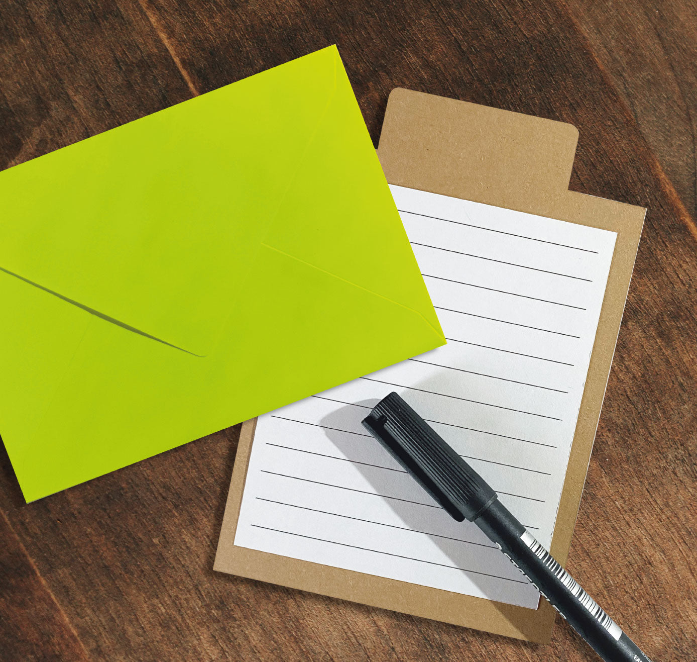 Include una busta in un colore a sorpresa. Sul retro, puoi facilmente posizionare al centro il foglio a righe (autoadesivo) incluso e scrivere i tuoi auguri personali.