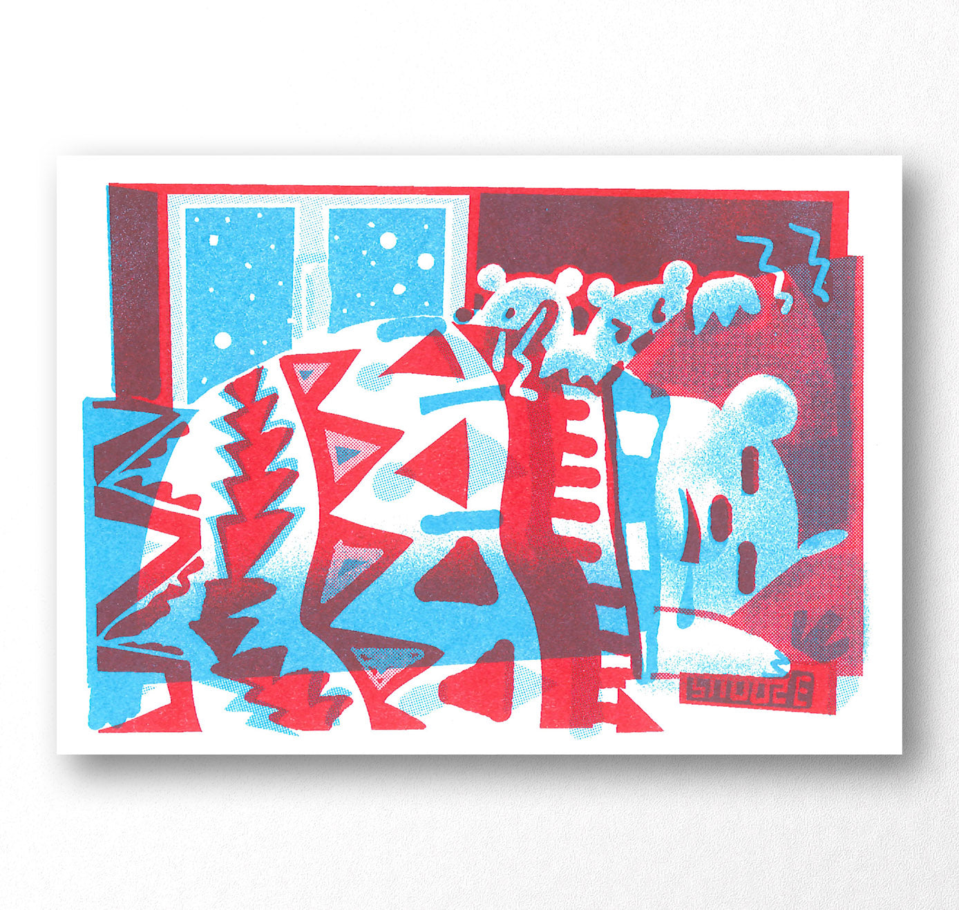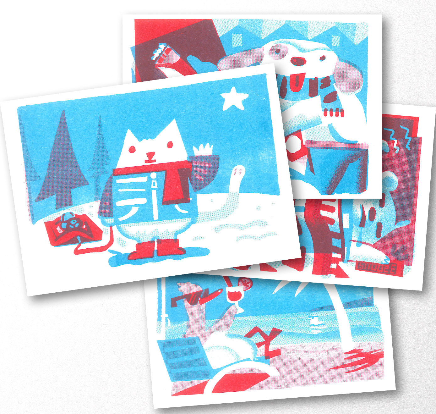 Quattro cartoline, formato A6, risograph a 2 colori, 300 g/m2.