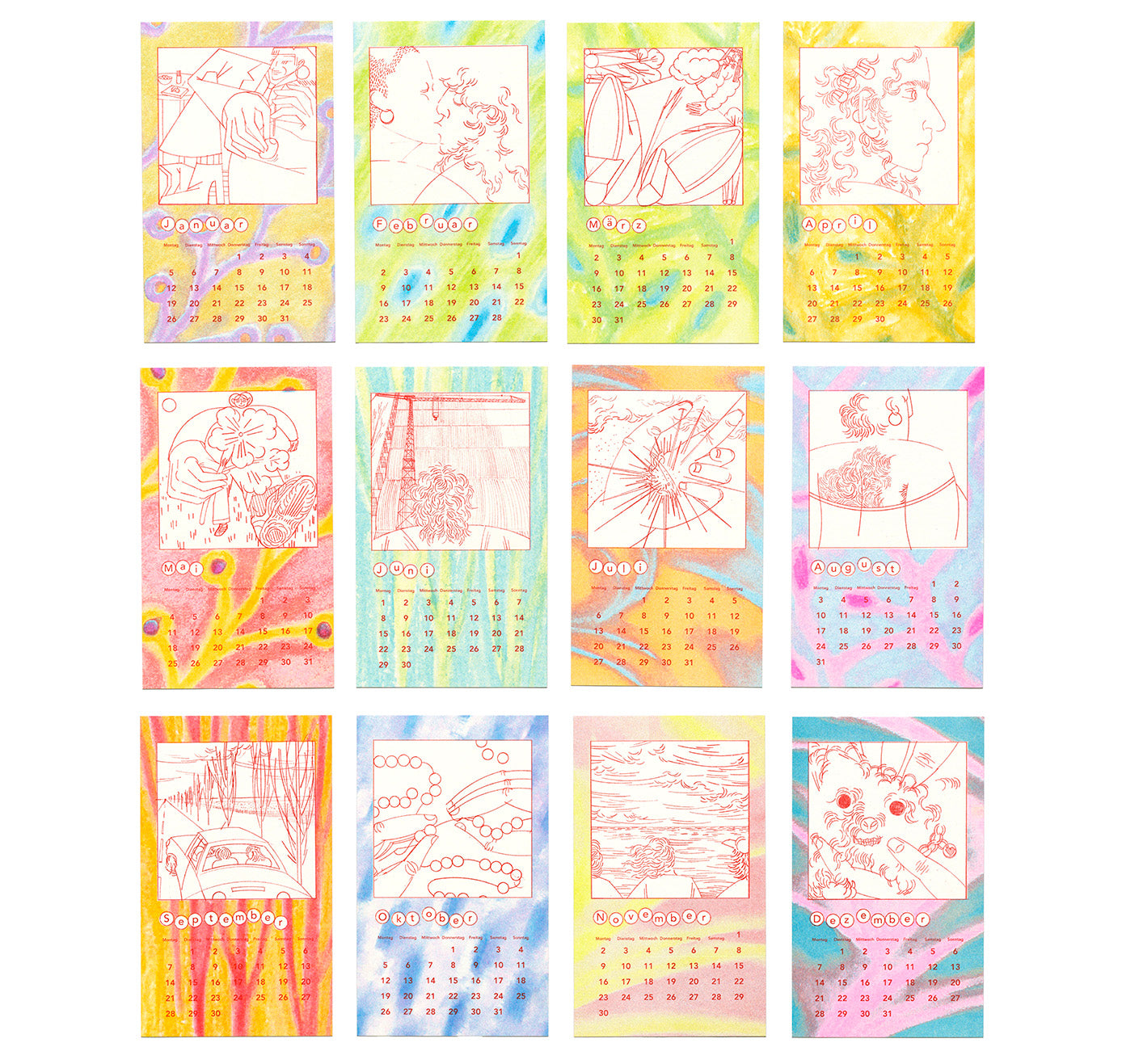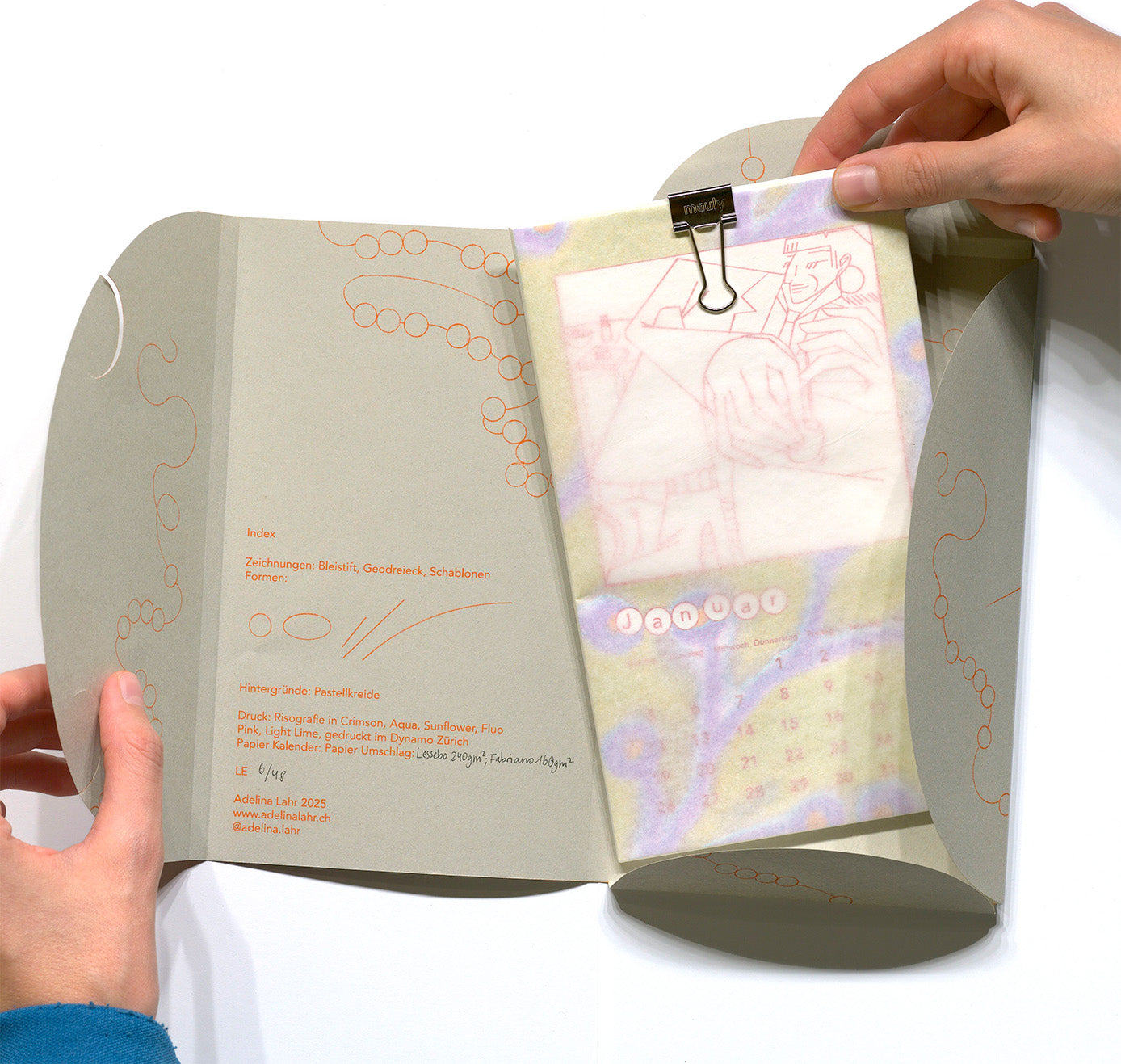 Die filigranen Zeichnungen wurden von der Künstlerin mit Geodreieck und Schablone angefertigt und durch bunte, mit Pastellkreiden gemalte Hintergründe ergänzt. Der Kalender wurde mit insgesamt sechs Farben mit der Risographie-Technik gedruckt.