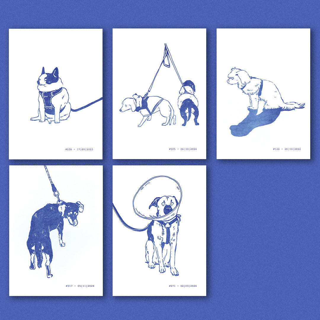 The Dogs are Waiting – anlässlich der gleichnamigen Satelliten-Ausstellung anlässlich des Fumetto Comic Festival Luzern, entstand dieses Set aus fünf Postkarten (A6), mit verschiedenen wartenden Hunde.