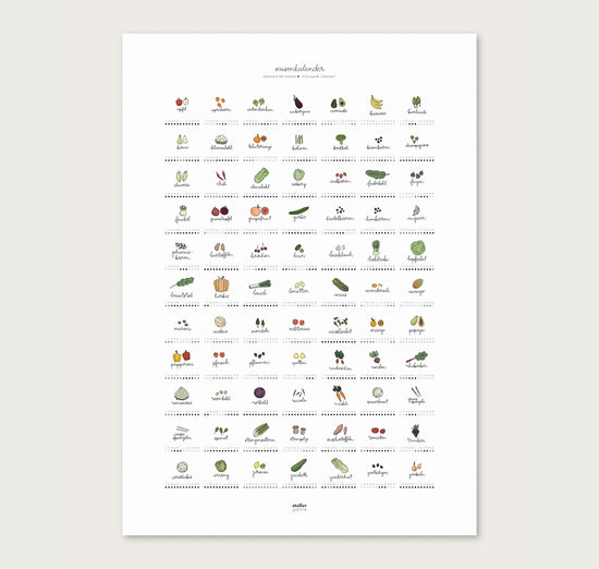 Saisonkalender A2 mit Angaben zur Verfügbarkeit von Früchten & Gemüse in der Schweiz & Europa