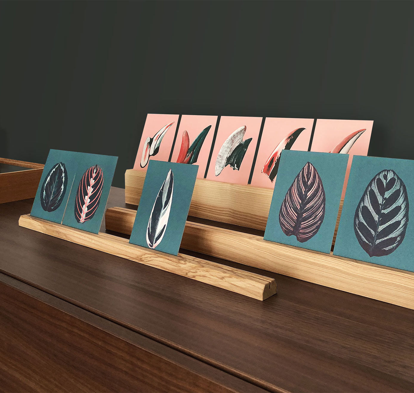 Ein schlichtes und diskretes Holzdisplay zur Präsentation einer Small Print Collection oder von 5 beliebigen Karten in A6 Format.