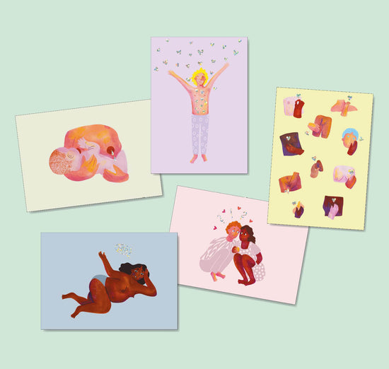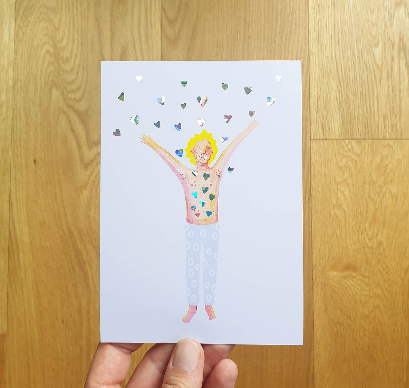 5 verschiedene Postkarten mit Glitzerfolie, Digitalprint, 300g, A6, Papier, einseitig bedruckt