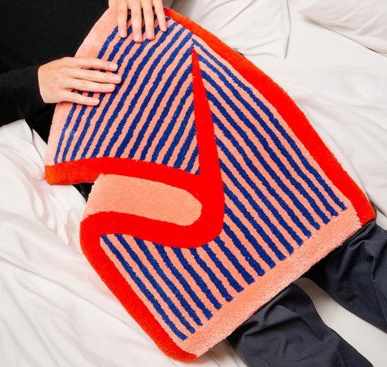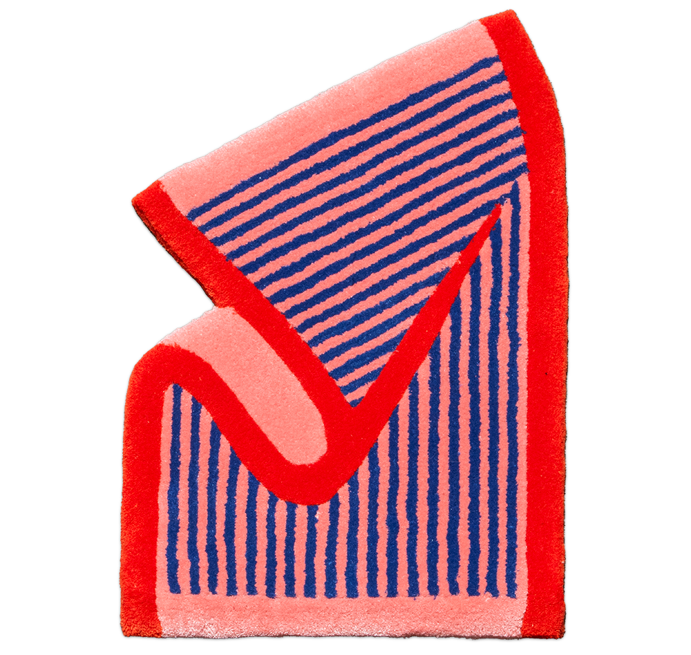 FOPLI ist eine Serie handgetufteter Objekte, inspiriert von einer alltäglichen Beobachtung. Während ich versuchte, meinen Teppich perfekt flach auf den Boden zu legen, fragte ich mich: Warum eigentlich? Warum nicht einfach die Unordnung zulassen? Die Irritation, die ein schief liegender Teppich auslösen kann, ist erstaunlich stark – so stark, dass ich sie in ein grafisches, lebensgrosses Objekt übersetzt habe.