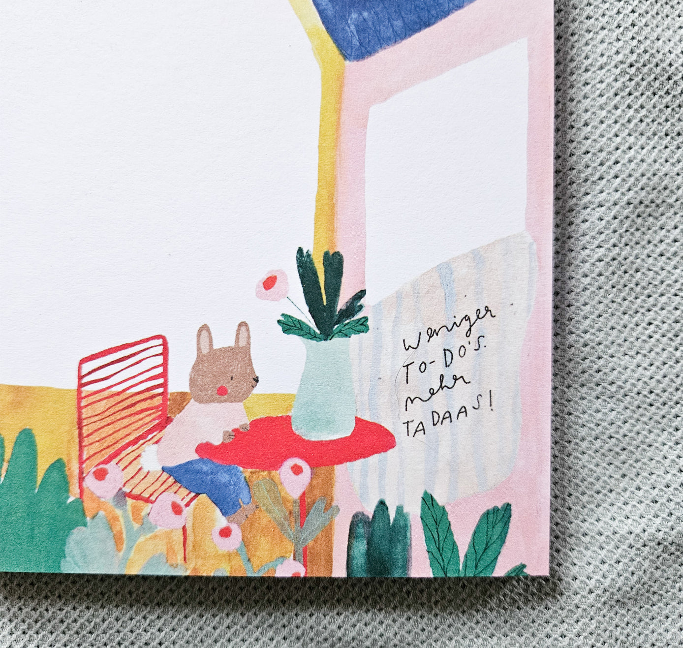Ich habe ursprünglich Detailhandelsfachfrau in einer Papeterie gelernt, später als Sozialarbeiterin gearbeitet und heute bin ich Quereinsteigerin als Illustratorin. Farben und Malen ziehen sich dabei wie ein roter, vielleicht sogar bunter Faden durch meinen Lebenslauf. Unter dem Label froleinmint gestalte ich in meinem Atelier in Weinfelden farbenfrohe und poetische Illustrationen für die kleinen und grossen Freuden des Alltags. Meine Ideen entstehen aus dem, was mich umgibt: aus Alltagsbeobachtungen, aus der Natur, aus Gesprächen, aus Büchern und aus kleinen Momenten zwischendurch. Daraus entstehen verschiedene Produkte, die ihren Weg in meinen Onlineshop finden. Ich arbeite sowohl analog als auch digital. Besonders gerne mit Aquarell, Farbstift und Filzstift, Gouache und natürlich vielen Papierschnipseln. Ich kombiniere oft verschiedene Materialien und mag es Neues auszuprobieren. Viel Freude beim Eintauchen.
