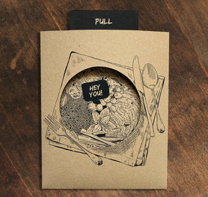 Alles an dieser Karte wurde von Hand mit Herzblut gemacht: gezeichnet, gelayoutet, geschnitten, gefalzt sowie geklebt. Jedes Stück ist ein Unikat. Gedruckt auf 100% Recylingpapier.