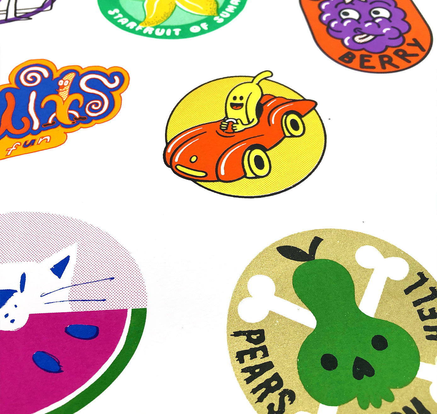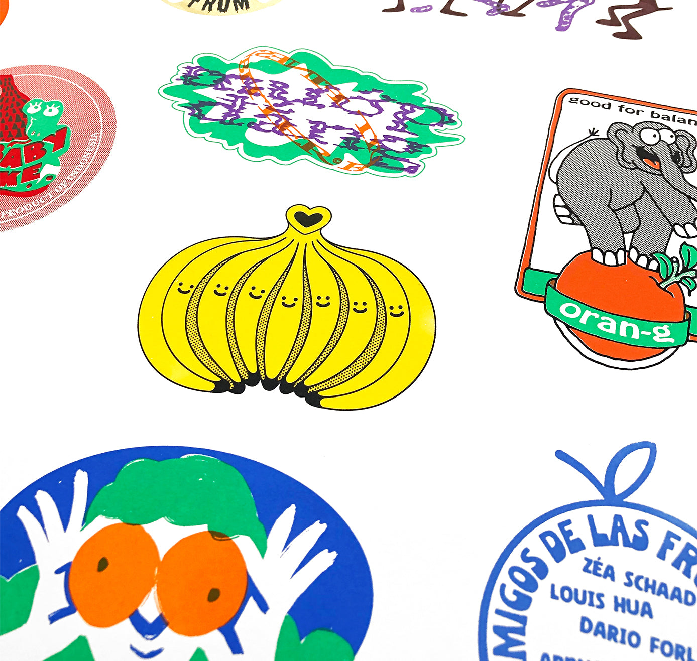 Amigos de las Frutas ist eine Sammlung von 18 Fruchtstickern und entstand in einer Kollaboration mit Dario Forlin, Zéa Schaad, Louis Hua, Arbnore Toska, Amiel Lammersdorf, Marisa Zürcher und Joël Roth. Die Prints wurden von Hand im Print Club St.Gallen gedruckt und können kleine charmante Unregelmässigkeiten im Druck aufweisen.