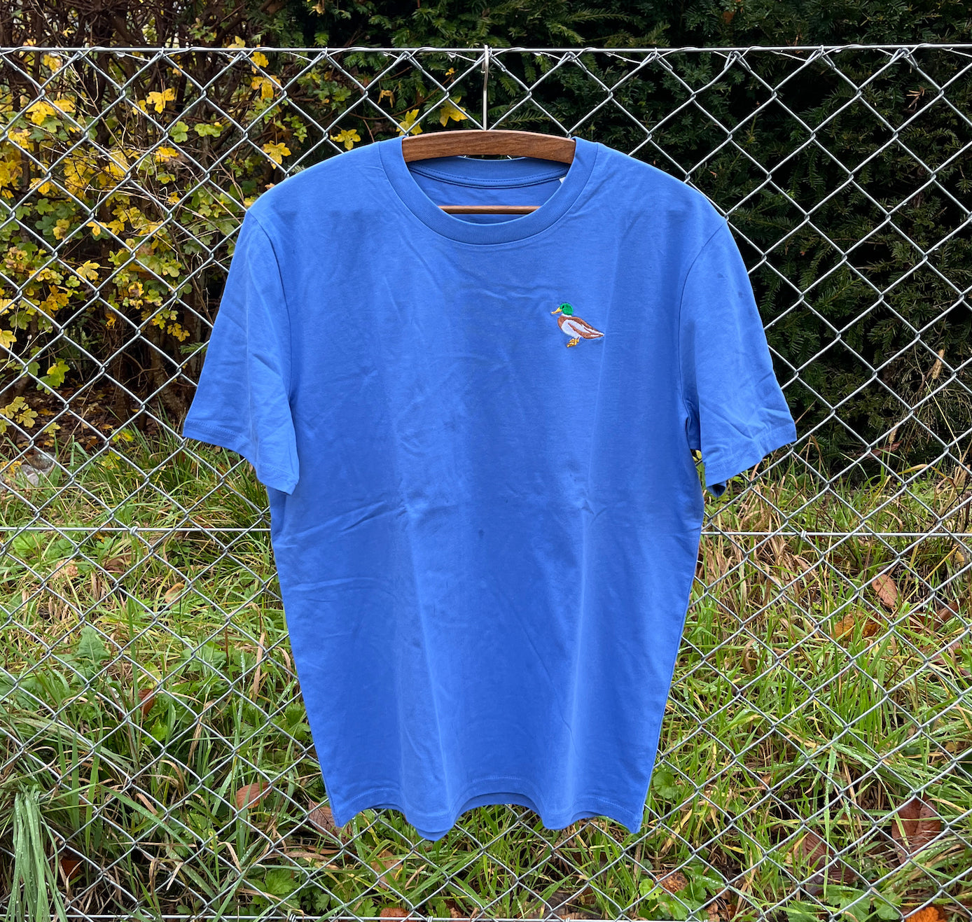 Das Shirt zeigt eine gestickte Stockente über der linken Brust.