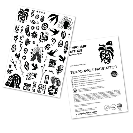 Du wolltest schon immer ein Tattoo, bist aber unentschlossen und schmerzempfindlich? Dieses Set bietet dir eine Auswahl an schwarzen Tattoos, mit floralen bzw. Vogelmotiven, die je nach Person, Pflege und Körperstelle 2-7 Tage halten.