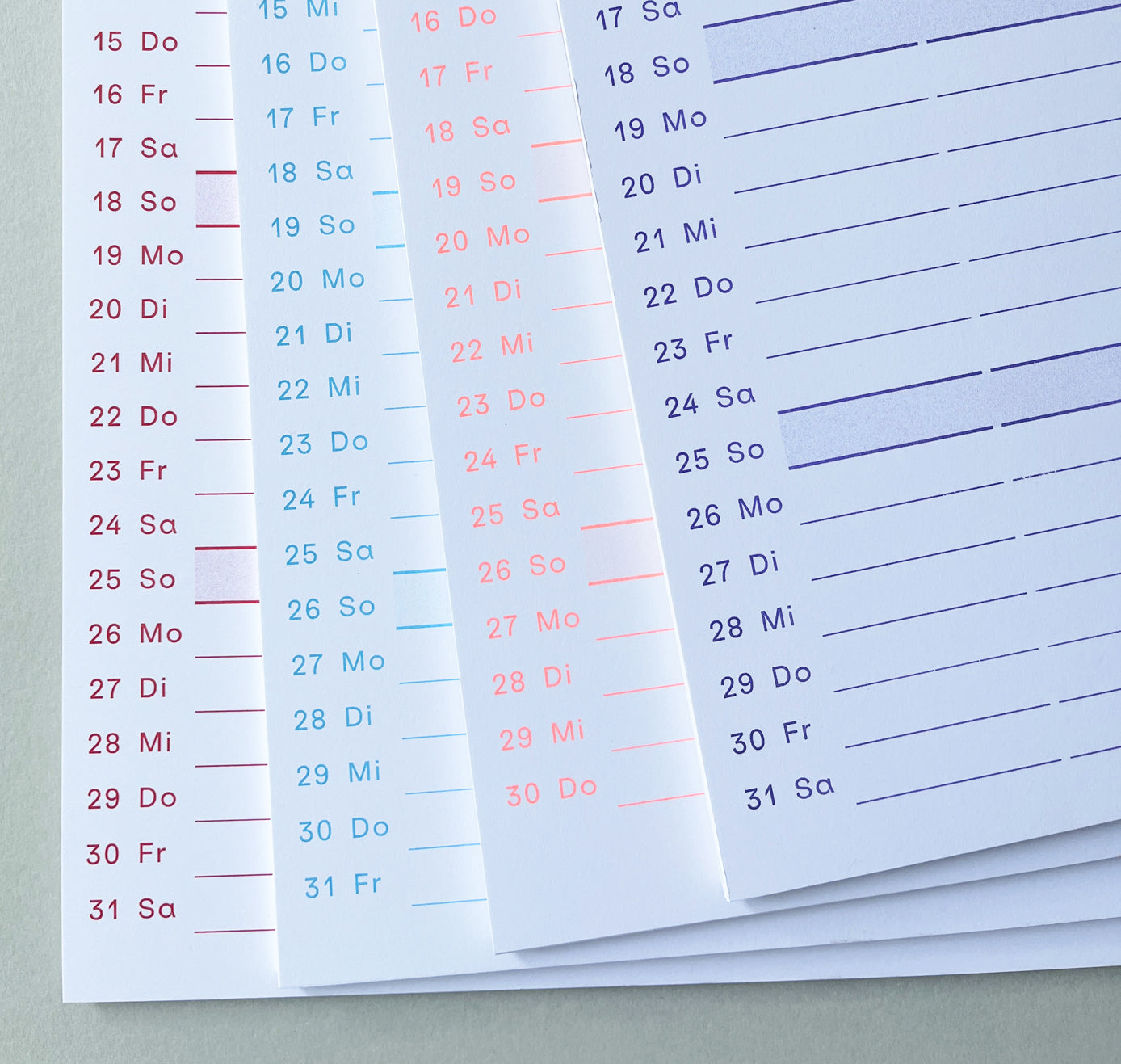 Der Kalender ist im schönen Risoverfahren gedruckt. Das verkürzte Cover im leuchtenden Orangeton verleiht dem Kalender einem frischen, modernen Akzent. Mit Angaben zu Kalenderwochen, Schweizer Feiertagen und Mondphasen.