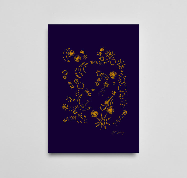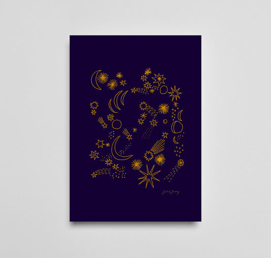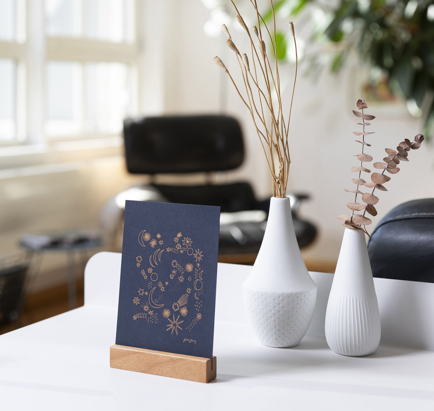 A6 (105 x 148 mm), mit passendem Umschlag, 1-farbiger Siebdruck, Kupferton, Papier: Sirio Color Dark Blue 300 gm2, Rückseite leer, Gedruckt in der Schweiz