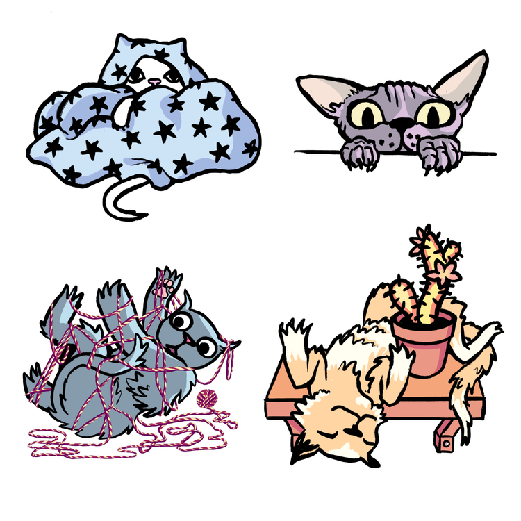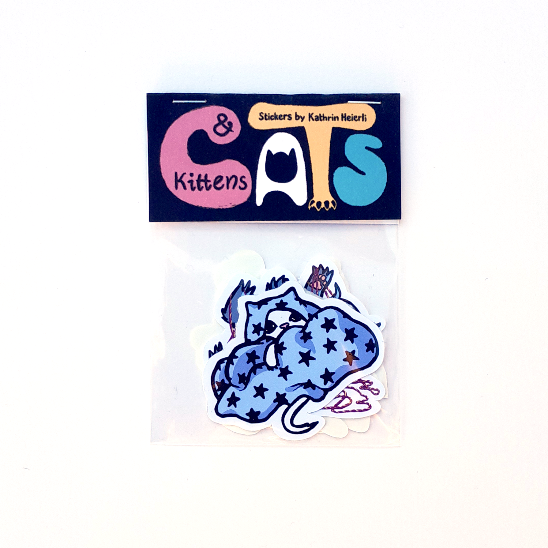 Stickers von vier gemütlichen, neugierigen und verspielten Katzen. Ein Büsi für fast jede Situation.