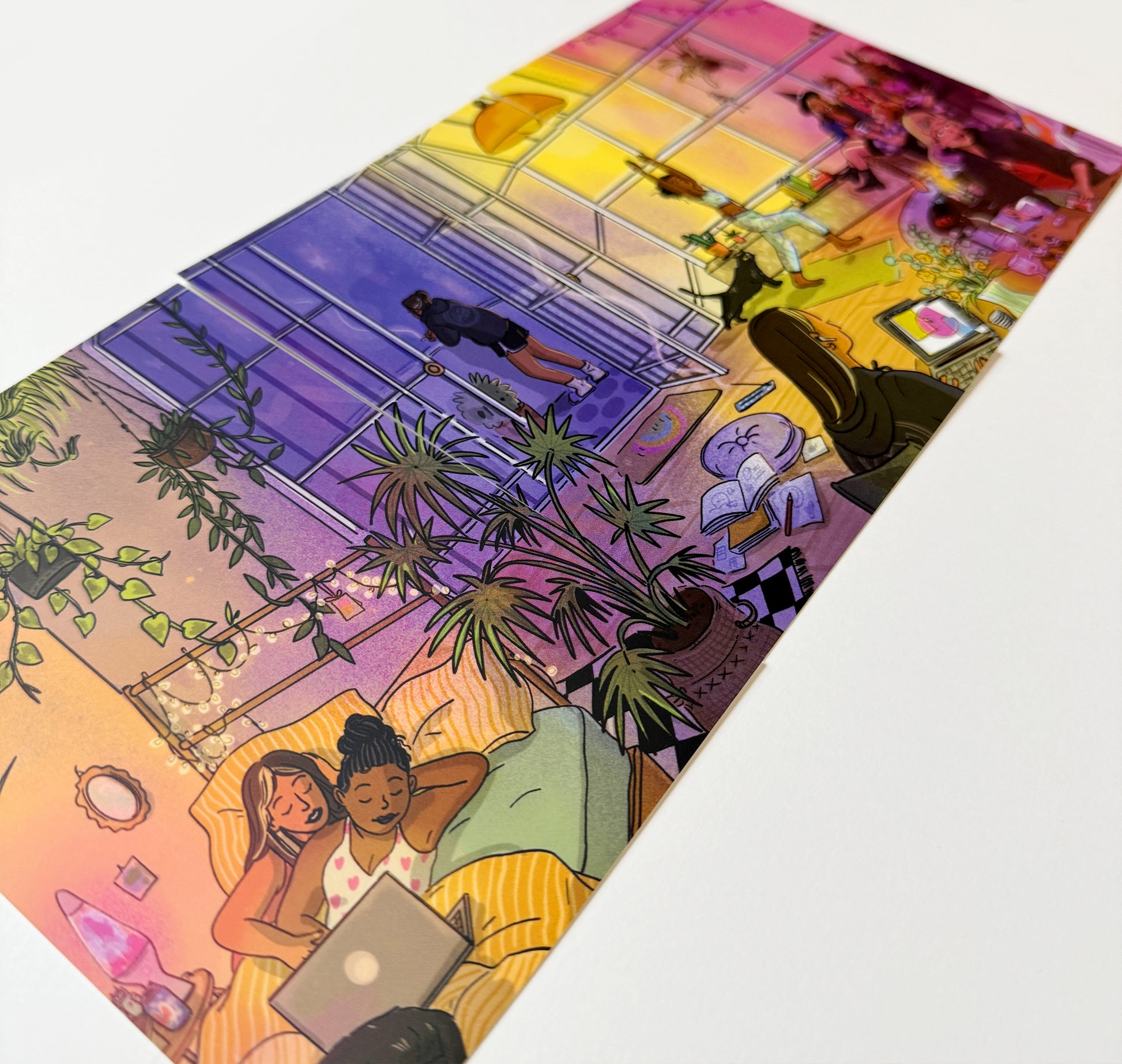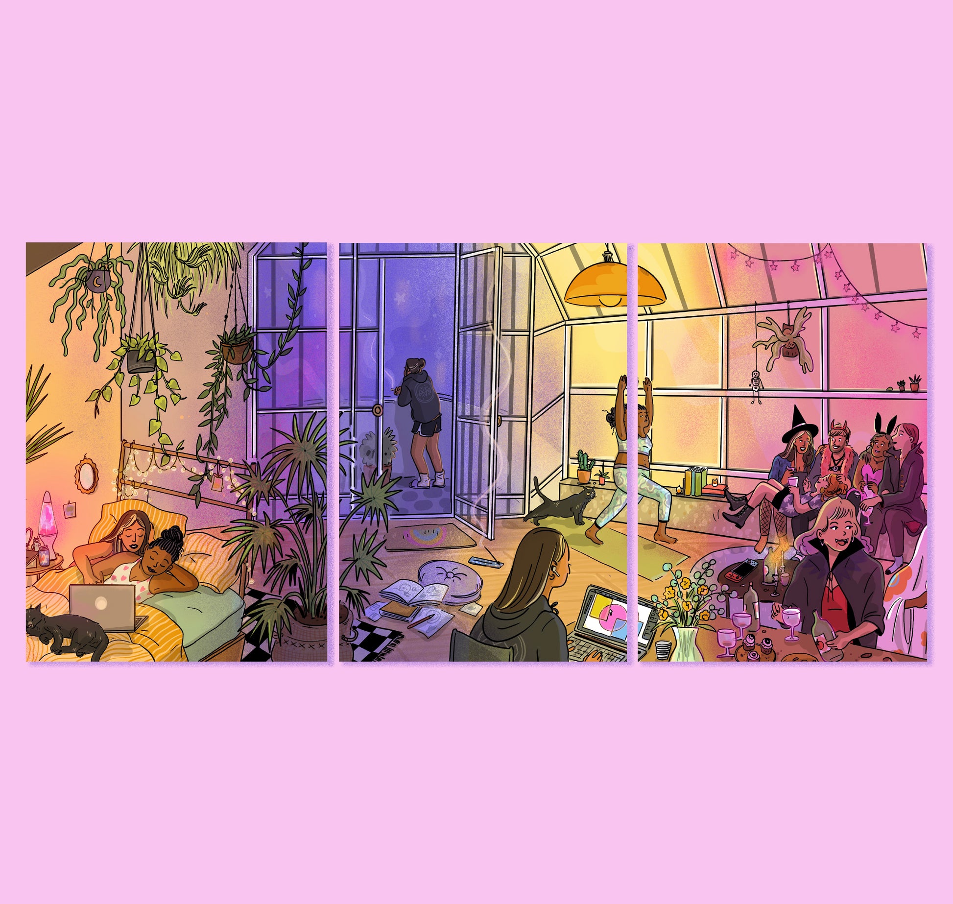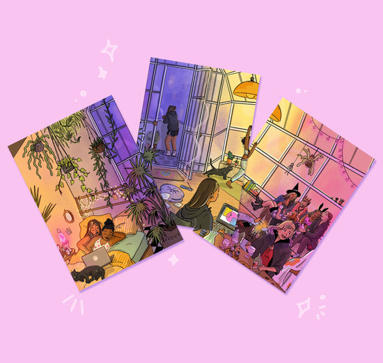 Das Postkartenset besteht aus drei cozy Karten, welche zu einem grossen Bild zusammengesetzt werden können, so dass ein Zuhause entsteht.