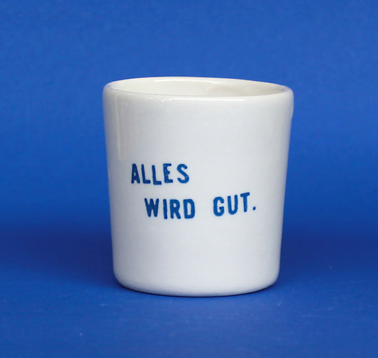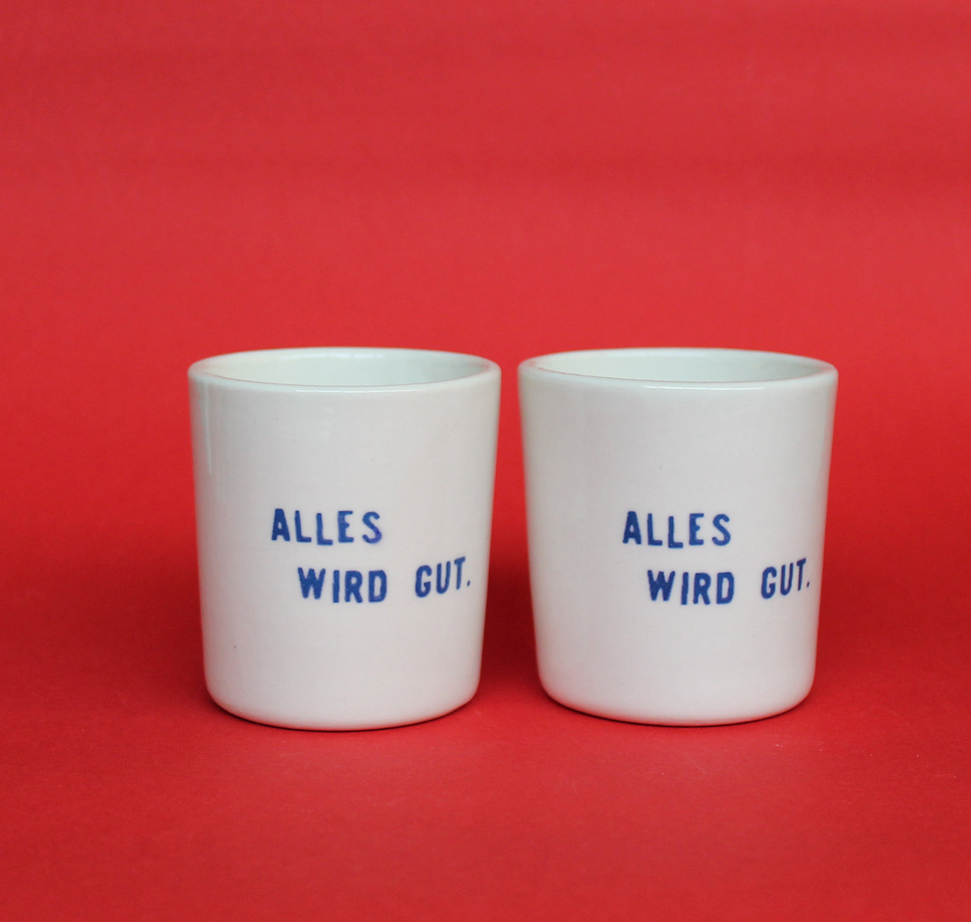 Die Becher werden von Janet Köckner vom Label Sisterhoodprints in ihrer Werkstatt in Luzern von Hand gegossen und im Siebdruckverfahren mit Unterglasur bedruckt. Die Becher können sich in Form und Farbigkeit minimal voneinander unterscheiden. Unebenheiten sind Ausdruck von Handarbeit und Laune von Brennofen und Glasurbeschaffenheit.