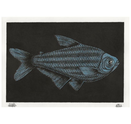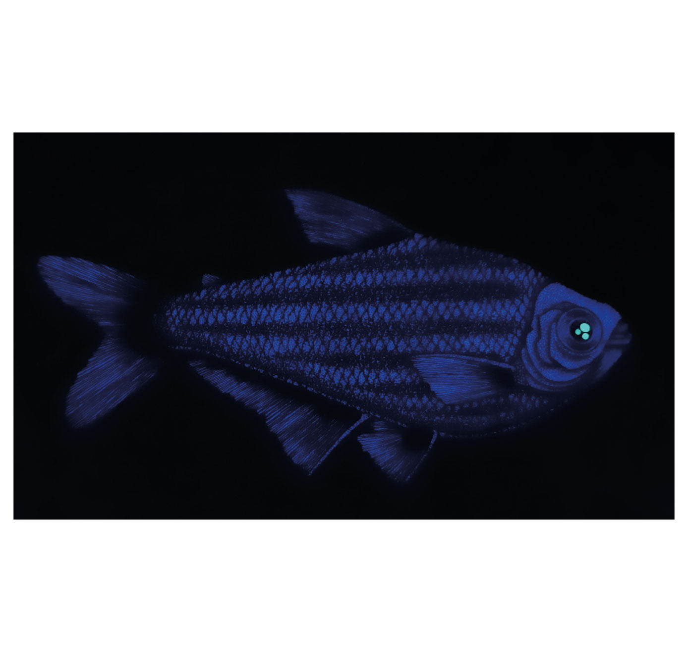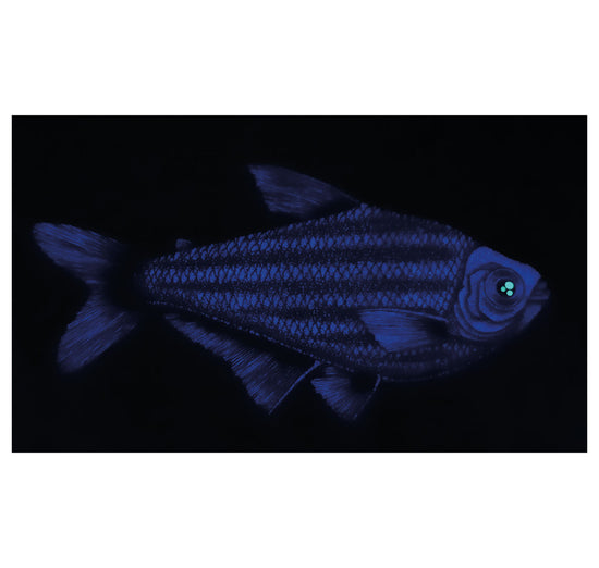 Die Leuchtfische wurden mit phosphoreszierender Acrylfarbe und schwarzer Tusche bemalt. Die phosphoreszierende Farbe lädt sich bei Lichteinwirkung auf und gibt sie im Dunkeln wieder ab. Je nachdem, wie stark die Farbe aufgeladen wurde, leuchtet sie entweder länger oder kürzer. Dadurch entsteht ein mysteriöses Erlebnis, ähnlich wie in den Tiefen des Meeres, wenn man einem Fisch begegnet und er kurz darauf wieder in der Dunkelheit verschwindet.