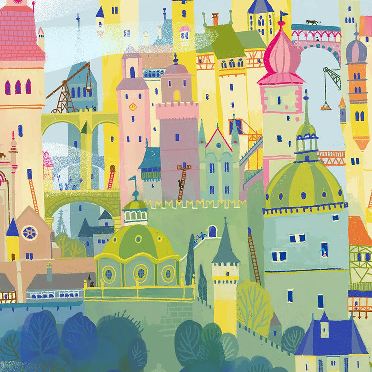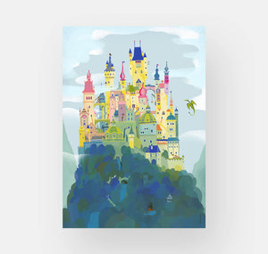 Hoch oben über dem verwunschenen Märchenwald thront das Schloss mit seinen bunten Türmen, Dächern, Erkern und Brücken. Über Jahrhunderte gewachsen, ist das Märchenschloss Ergebnis von verschiedenen architektonischen Stilen, die neben- und miteinander harmonieren. Zwischen den Wolken fliegt ein Drache, der das Schloss bewacht, während unten im Wald der Lindwurm in seiner Höhle lauert.