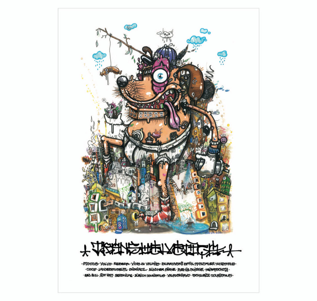 Das transhelvetische Plakat für die Ausgabe #49 «Hund» der Zürcher Künstler One Truth zeigt einen bunten Hund mit Rucksack, der aus der Stadt hinaus wandert in dieWelt.