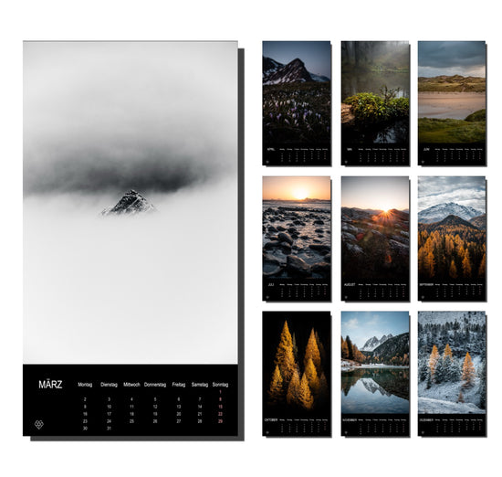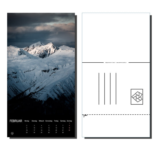Postkartenkalender mit 13 Postkarten mit Landschaftsmotiven. Mit Markierung zum korrekten Abtrennen nach dem jeweiligen Monat.